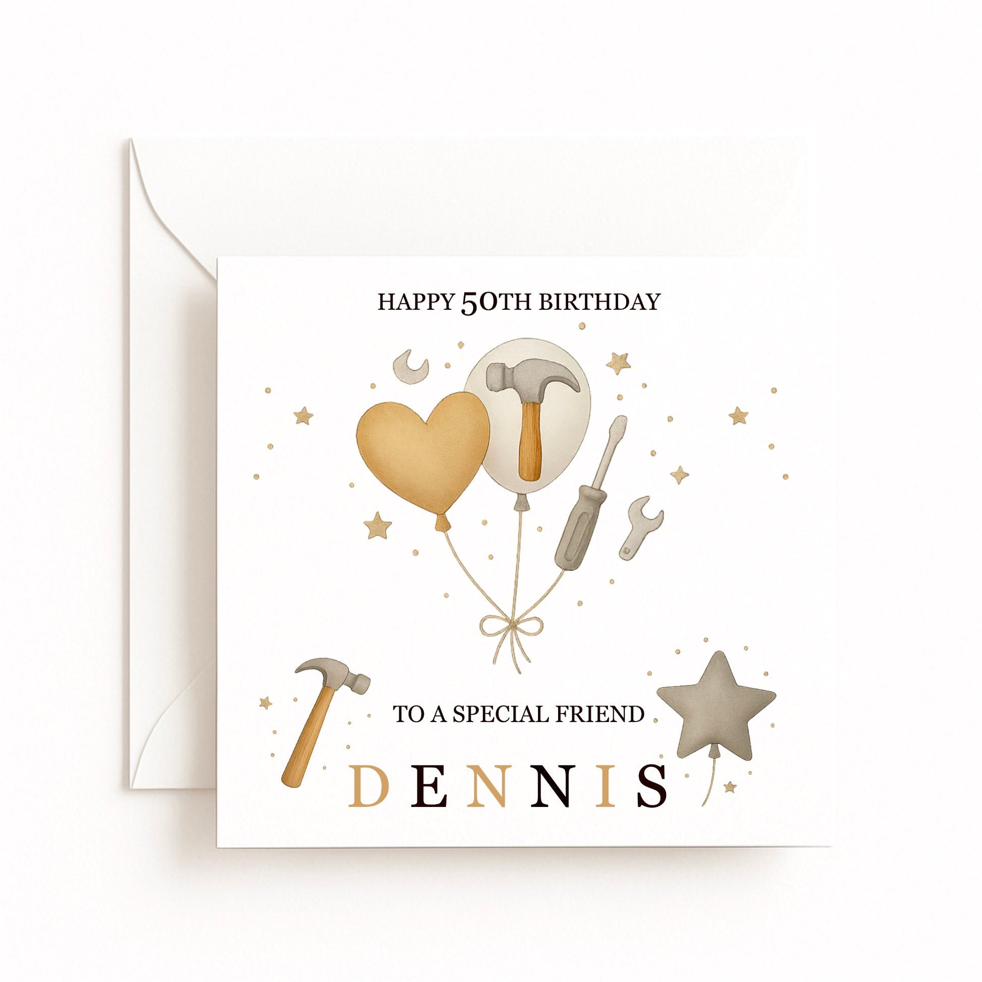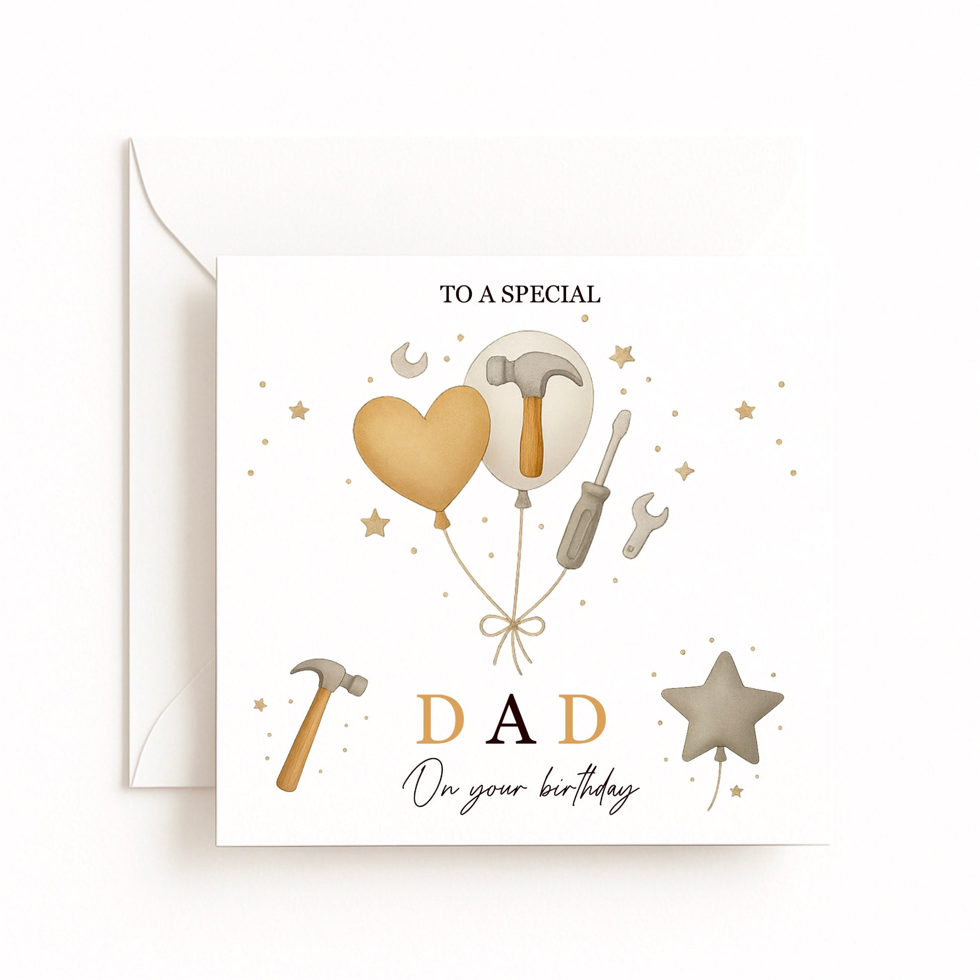 Celebrate their big day with this personalised tools birthday card, ideal for DIY lovers, builders, carpenters, or anyone who enjoys working with their hands. Featuring golden balloons, stars, and illustrated tools including a hammer, screwdriver and spanner, this handmade card can be customised with any name, age or message.