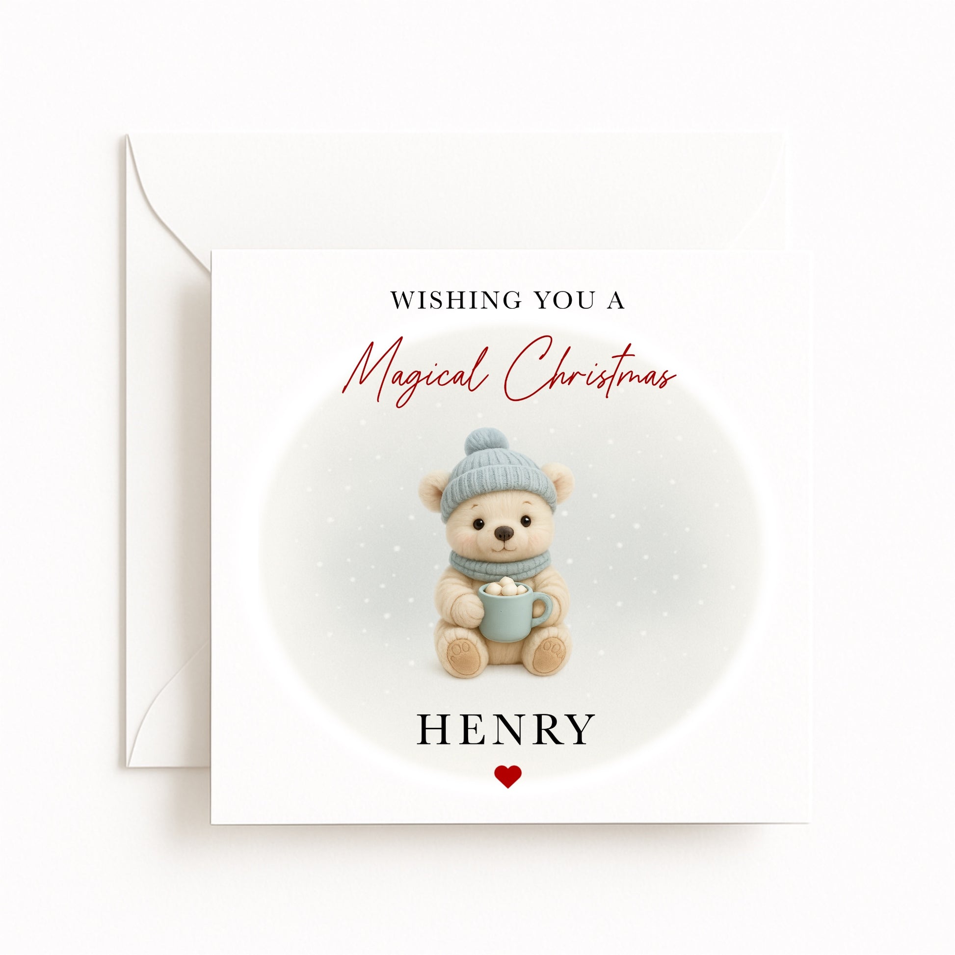 A charming Christmas card featuring a cute bear in a soft winter scarf and hat, holding a mug of hot chocolate. A lovely keepsake for a special magical Christmas, personalised with their name.