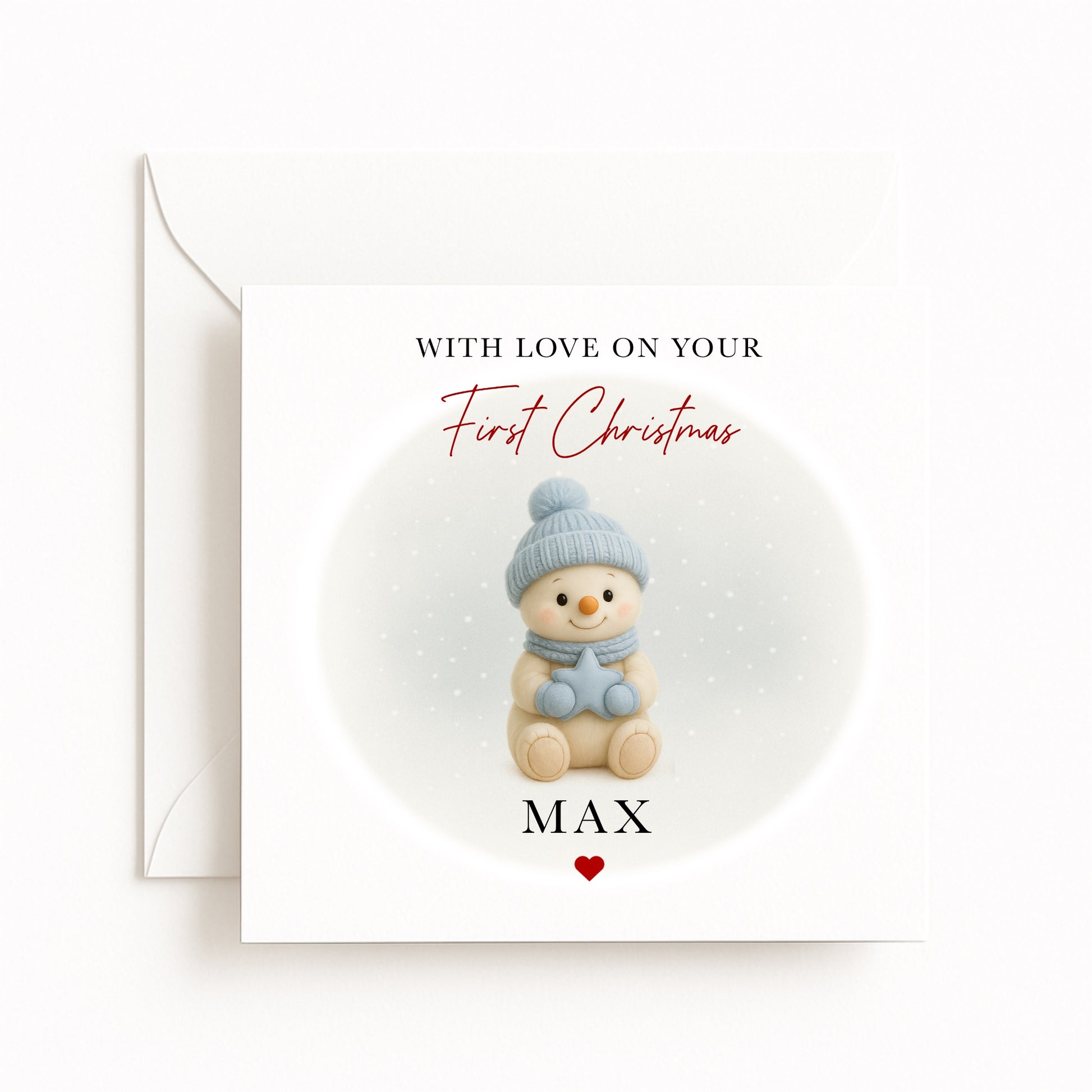 A sweet bear-themed Christmas card featuring an adorable bear in a cosy winter hat and scarf holding a mug of hot chocolate. Perfect for celebrating a baby’s first Christmas — personalised with any name.