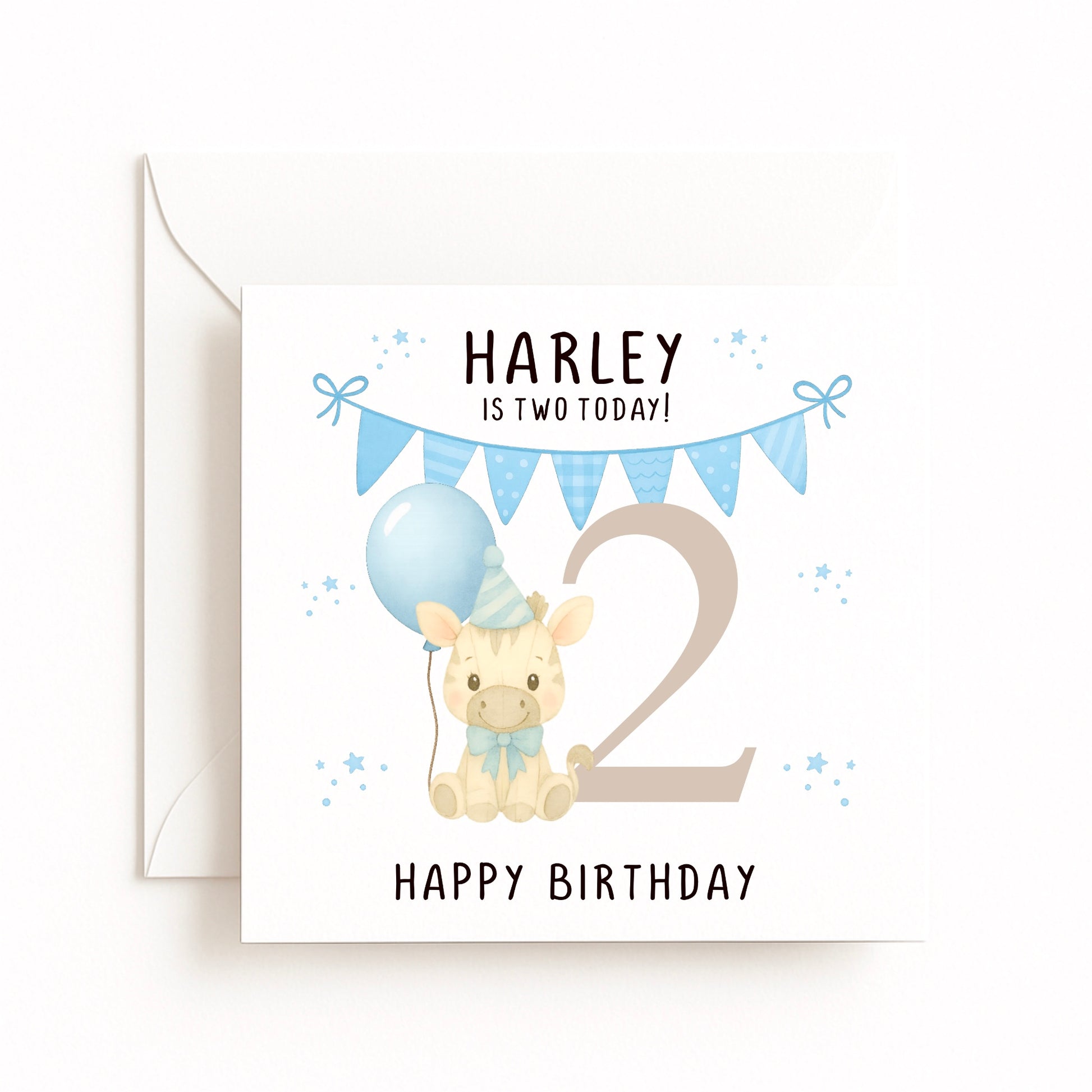 This personalised birthday card features adorable safari animals Zebra with blue bunting and balloons. Add the child’s name and age for a keepsake card that will be treasured.