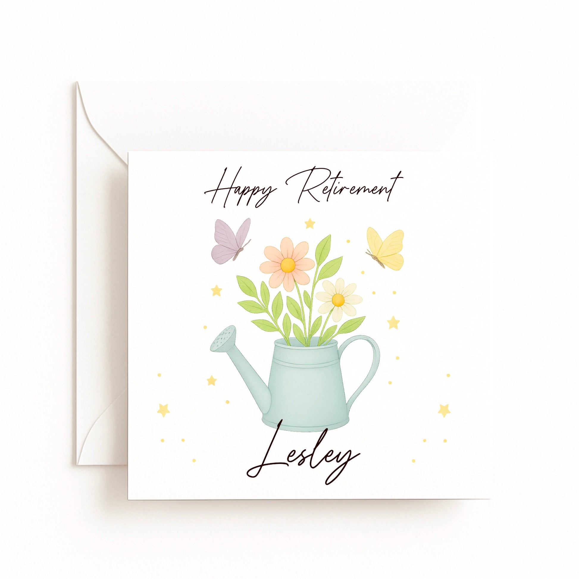 Celebrate their retirement in style with this charming personalised floral watering can card. Featuring soft pastel flowers, fluttering butterflies and delicate stars — perfect for gardeners or nature lovers! Add any name for a thoughtful, made-to-order keepsake.