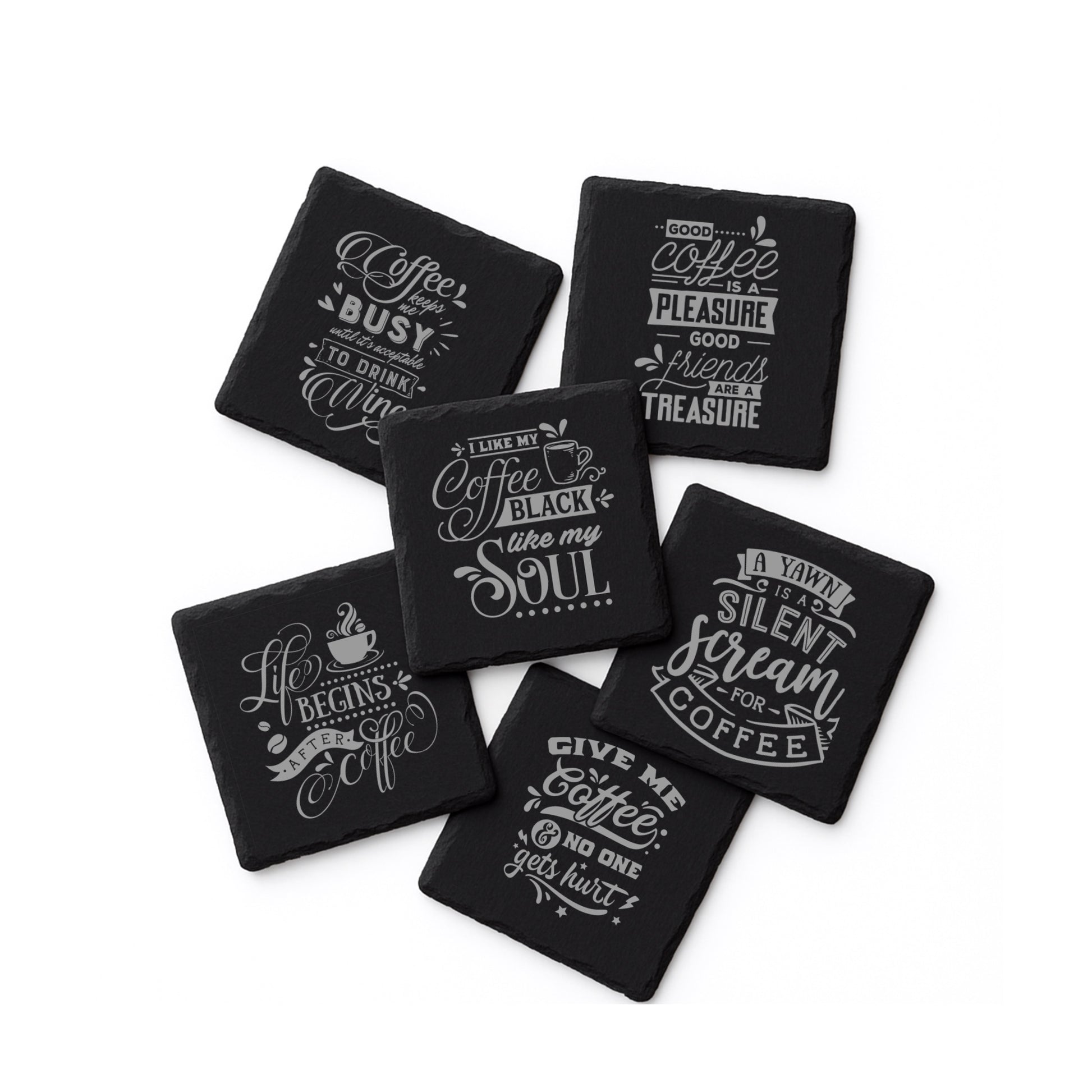 Add some humour to your coffee table with our natural slate coasters. Choose from 6 funny engraved coffee quotes or mix & match your favourites. Perfect as gifts for coffee lovers.