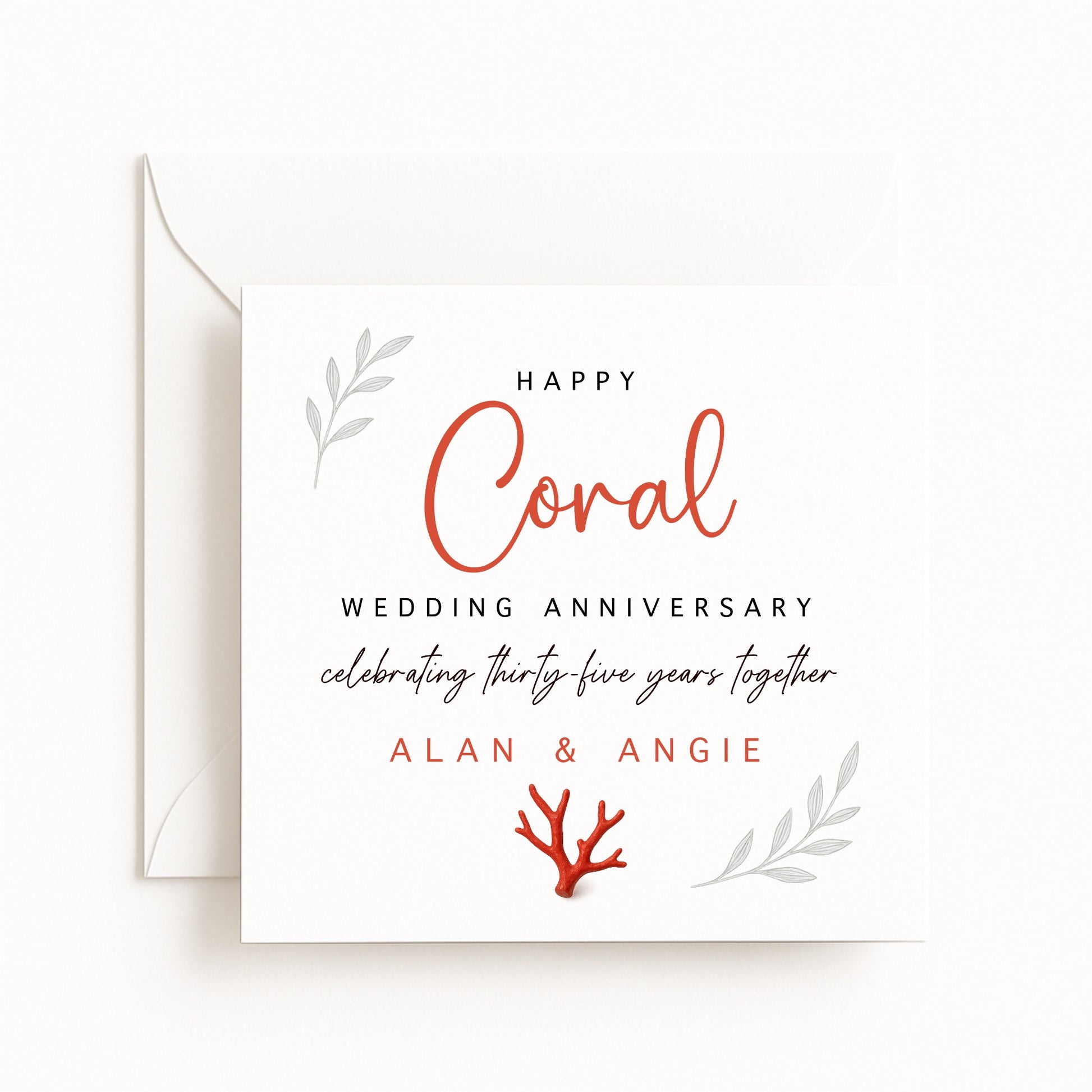 Celebrate thirty-five years of love with this elegant Coral Anniversary card, featuring a coral branch motif in rich terracotta tones and delicate silver leaves.