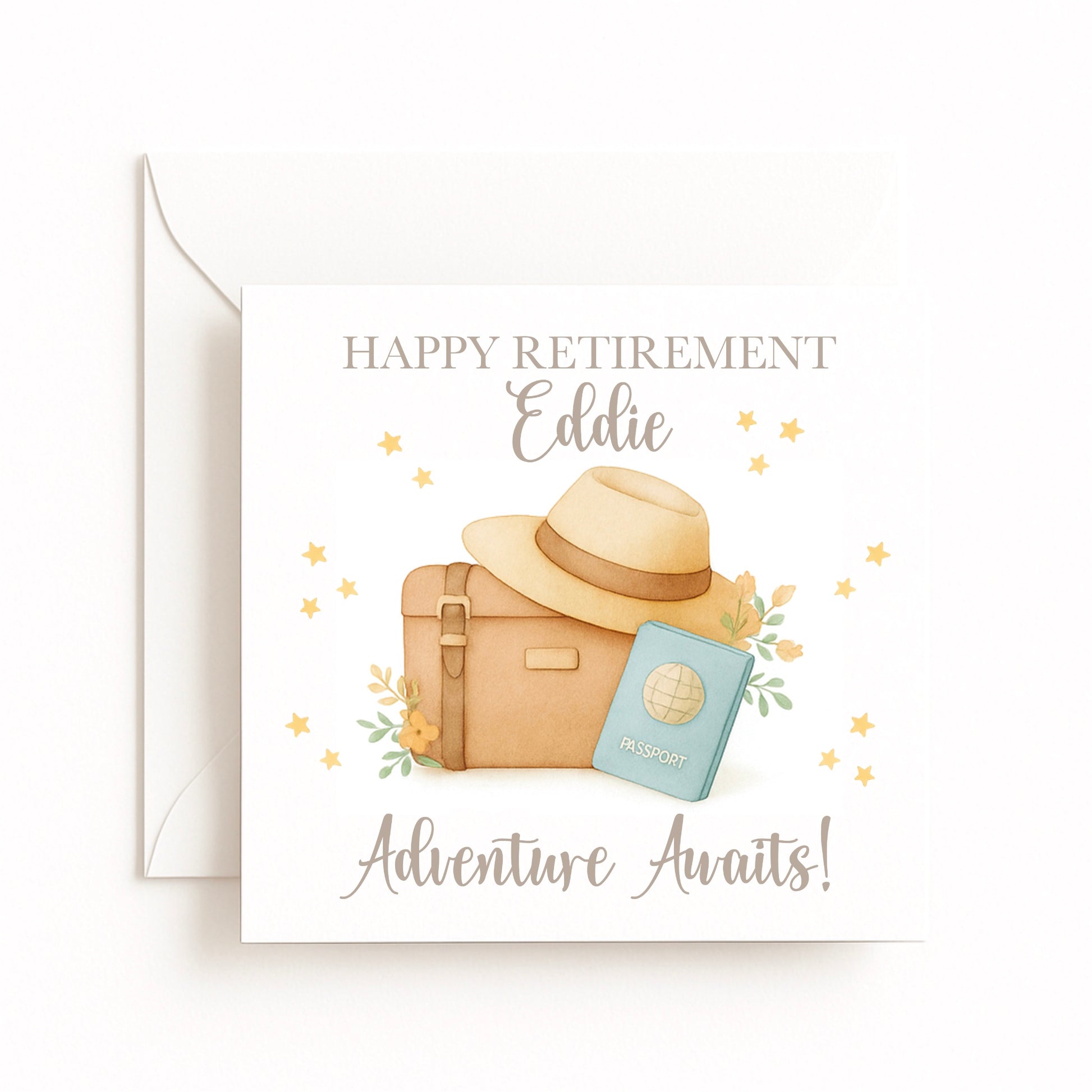 Send them off on new adventures with this travel-inspired card, featuring a suitcase, hat and passport. A timeless keepsake, printed on high-quality cardstock and personalised with any name.