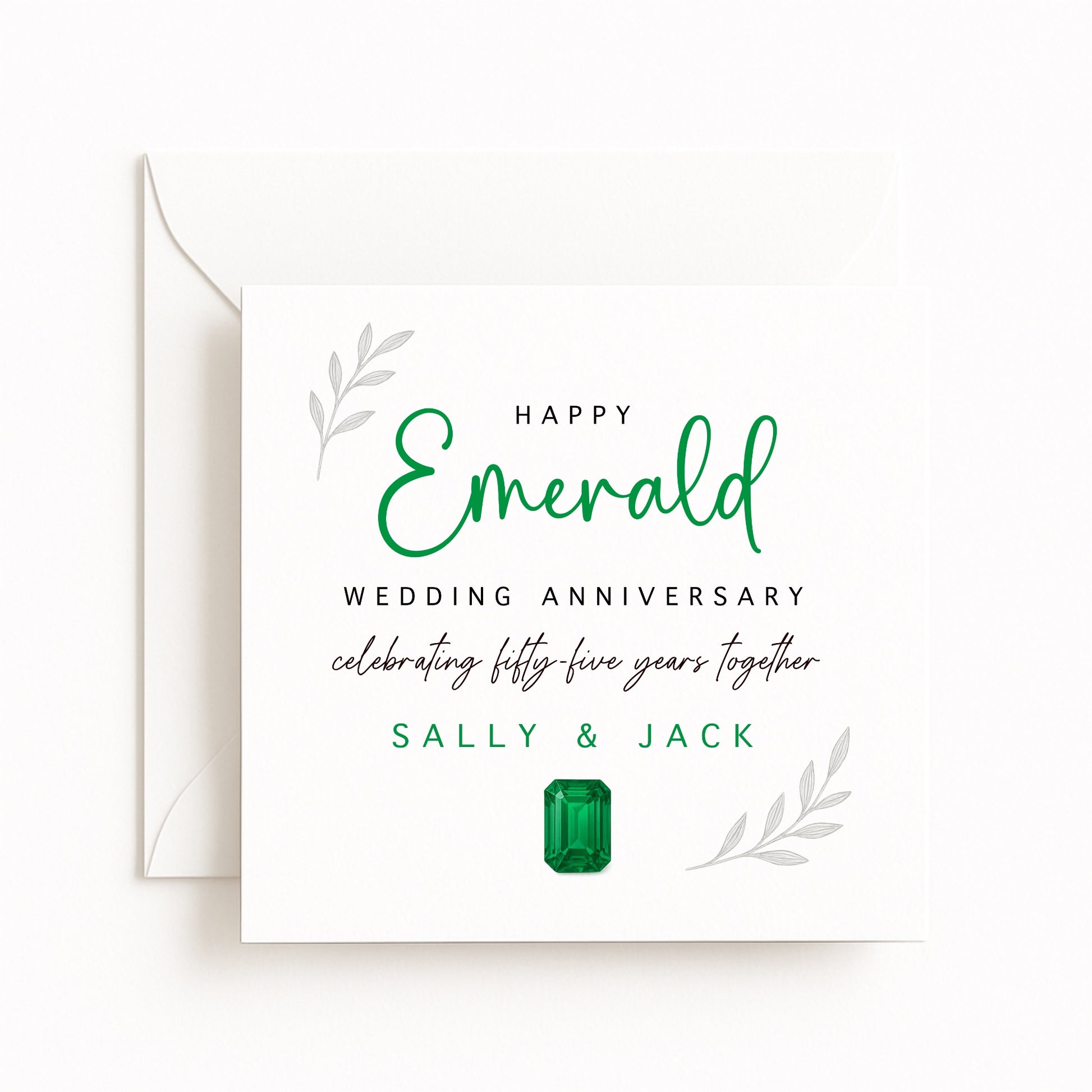 Celebrate fifty-five years of marriage with this striking Emerald Anniversary card, featuring rich green tones and delicate silver accents — simple, modern and meaningful.