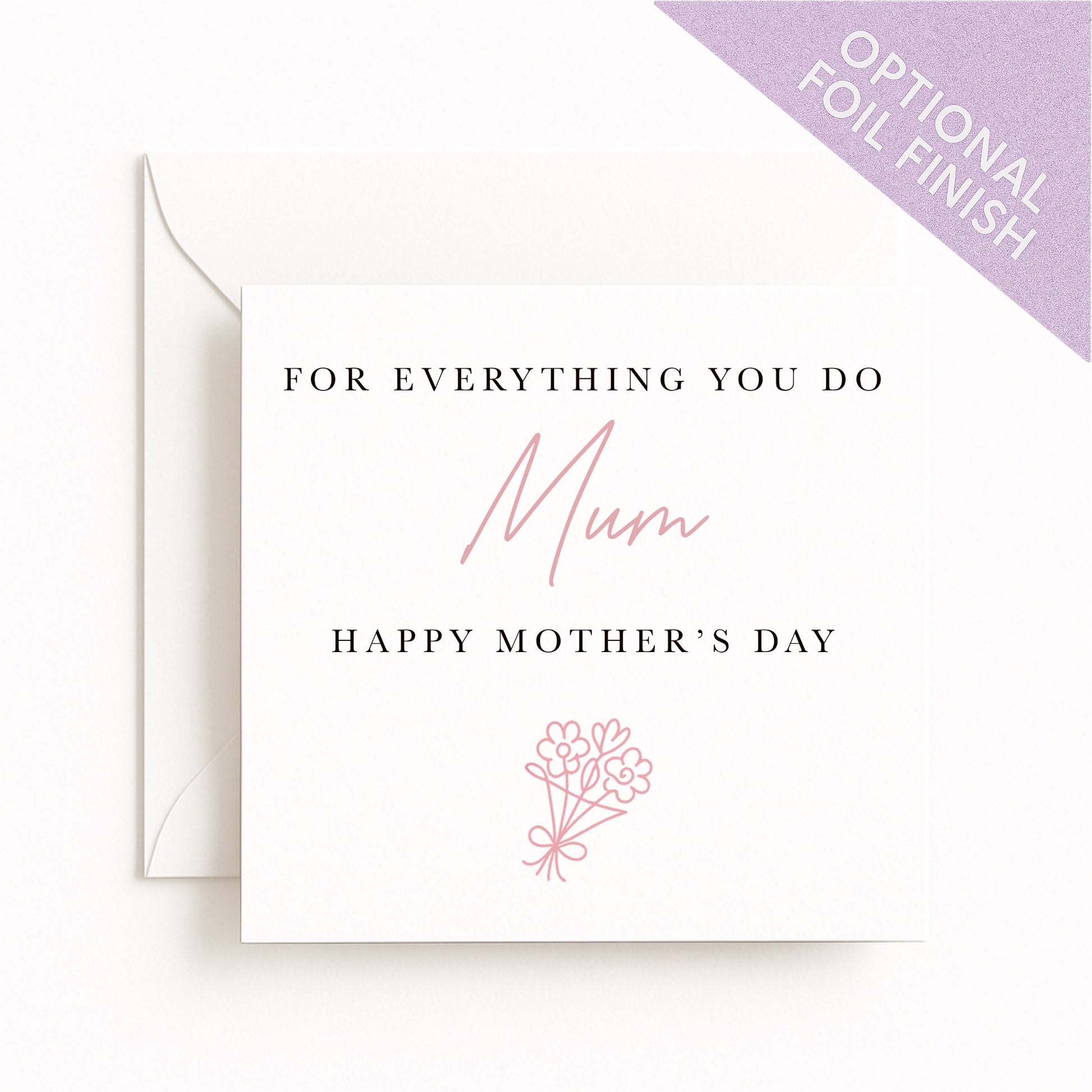 A simple yet meaningful “For Everything You Do Mum” card. Perfect for showing love and appreciation this Mother’s Day with its elegant modern typography and minimalist charm, add an optional real foil finish.