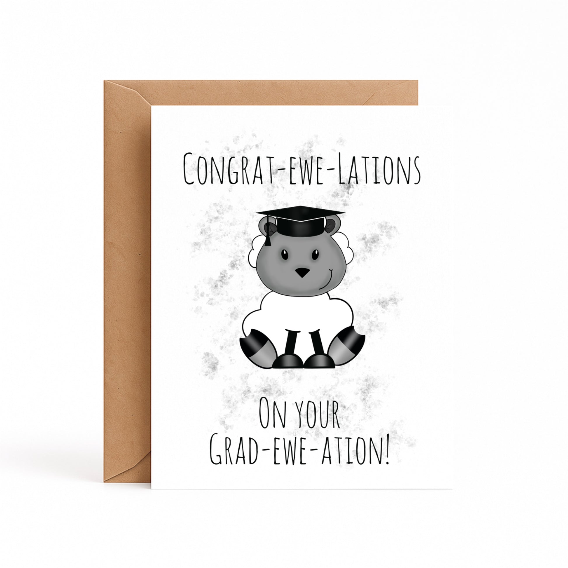 Celebrate their big achievement with a smile! This cute sheep graduation card features the fun pun “Congrat-Ewe-Lations on your Grad-Ewe-ation!” Perfect for graduates of all ages, this card is sure to bring a laugh alongside your heartfelt message.