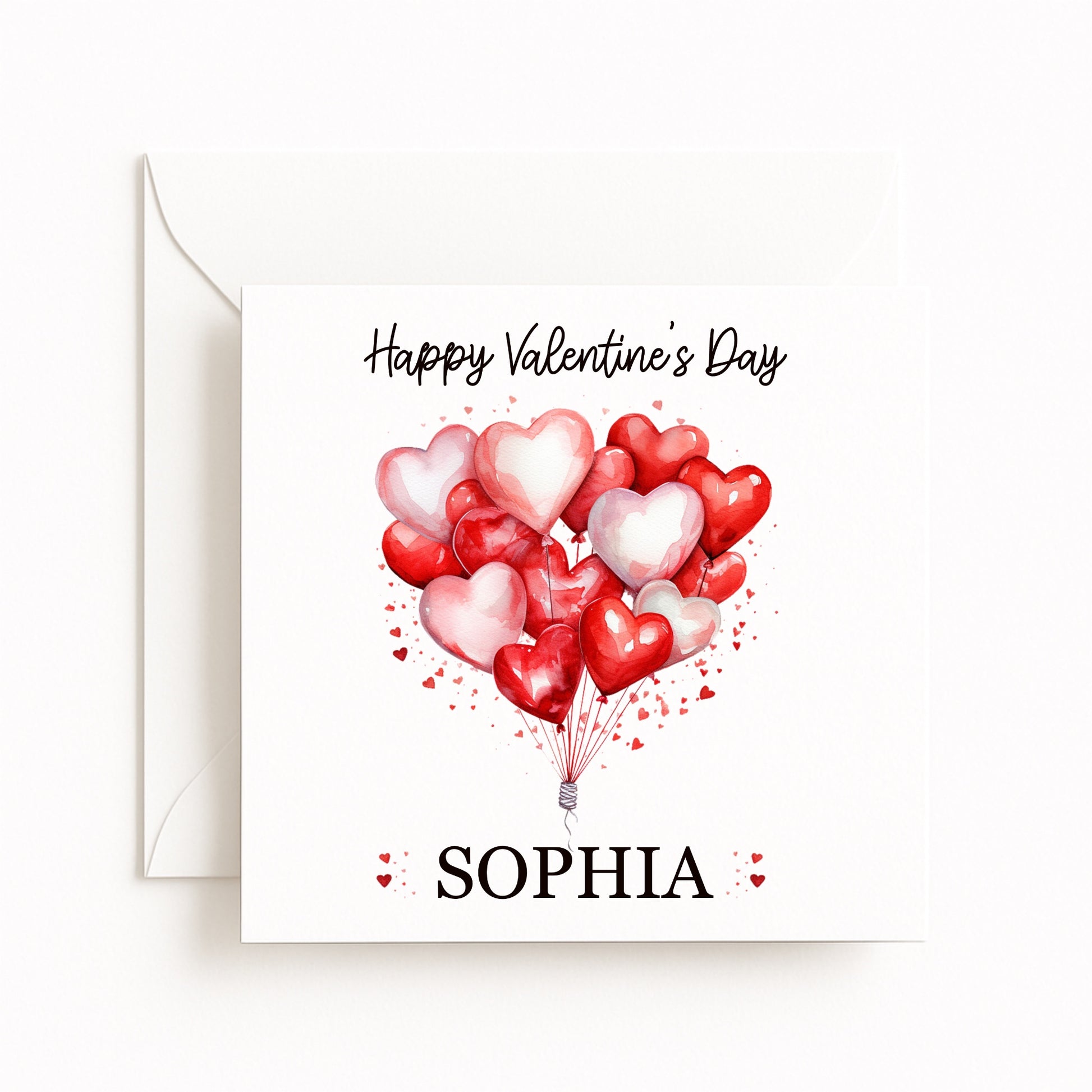 A bold and romantic Valentine’s card featuring a bouquet of red and pink heart balloons in a soft watercolour style. Perfect for expressing love to your partner, fiancé, or friend — personalised with their name for a heartfelt touch.