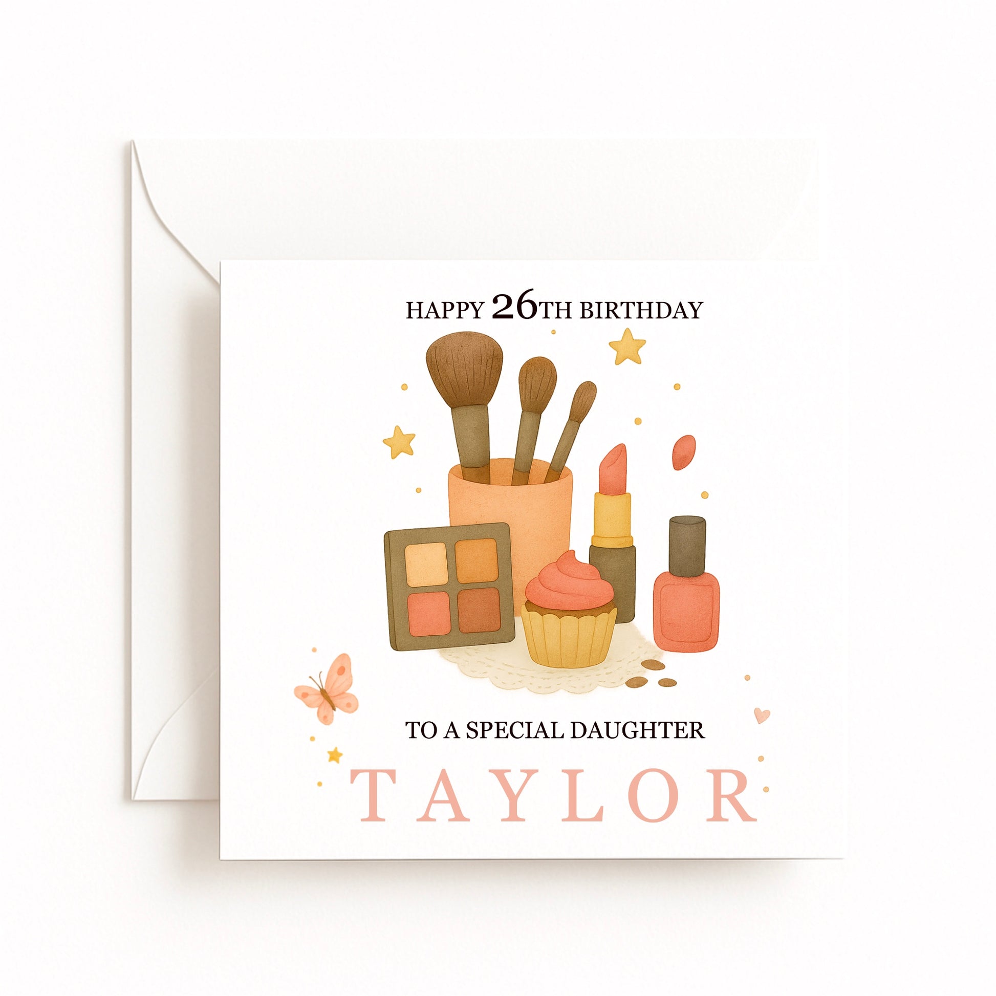 A glamorous birthday card featuring makeup brushes, palette, lipstick and cupcake. Personalised with name and age, perfect for makeup-loving teens and young women.