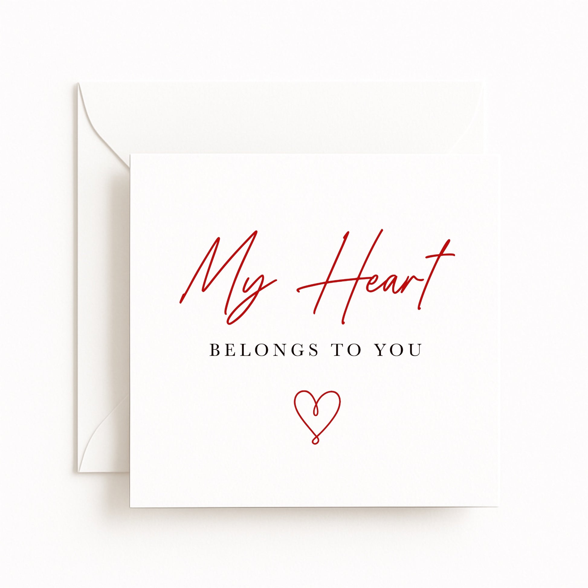 A heartfelt “My Heart Belongs to You” card with a clean, modern layout and elegant red script.