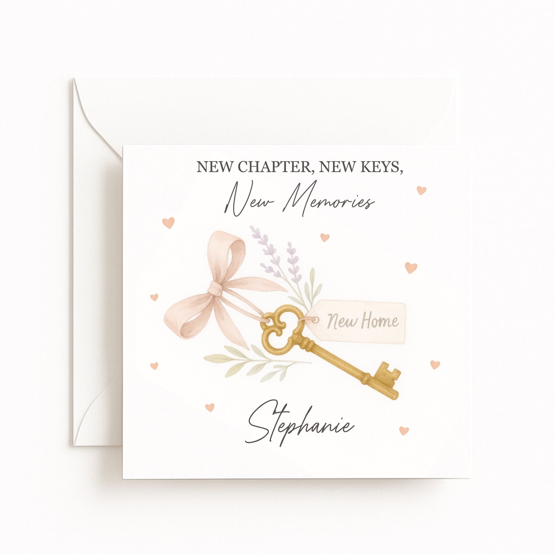 Celebrate a beautiful new beginning with this elegant blush-toned New Home Card. Featuring a golden vintage key tied with a soft watercolour bow and finished with gentle heart accents, it’s the perfect keepsake for anyone starting a new chapter.