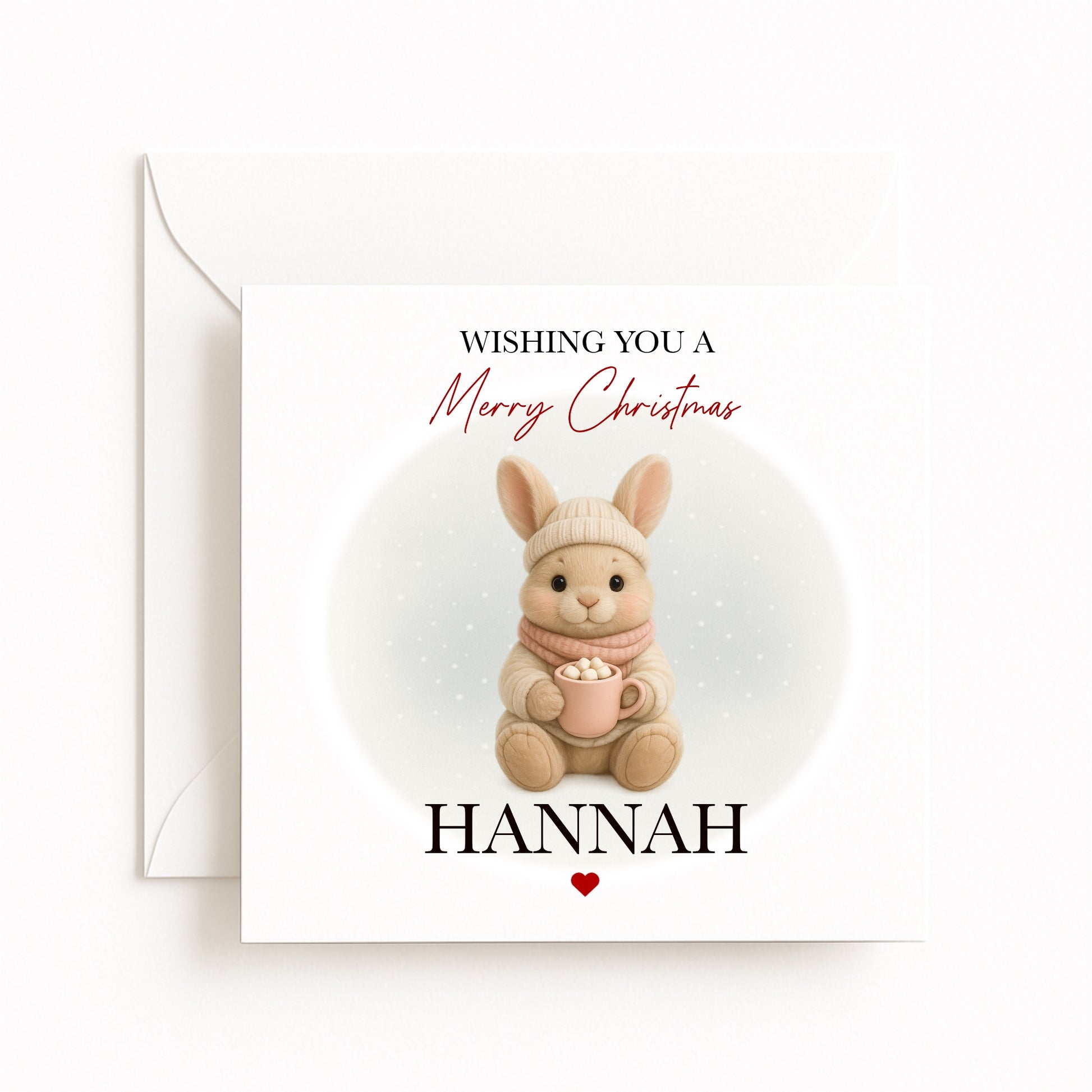 Send a warm and thoughtful Christmas greeting with our Cosy Character Christmas Cards — a charming collection of soft winter illustrations featuring a cute rabbit wrapped up snug with a festive hot chocolate in hand.