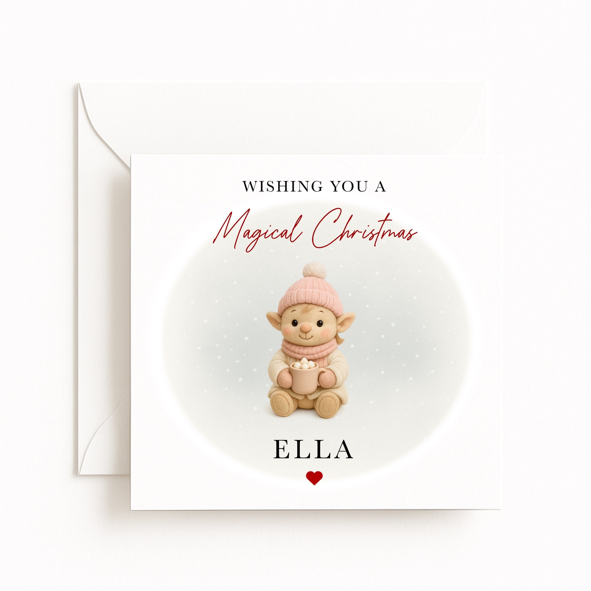 A charming Christmas card featuring a cute Elf in a soft winter scarf and hat, holding a mug of hot chocolate. A lovely keepsake for a special magical Christmas, personalised with their name.