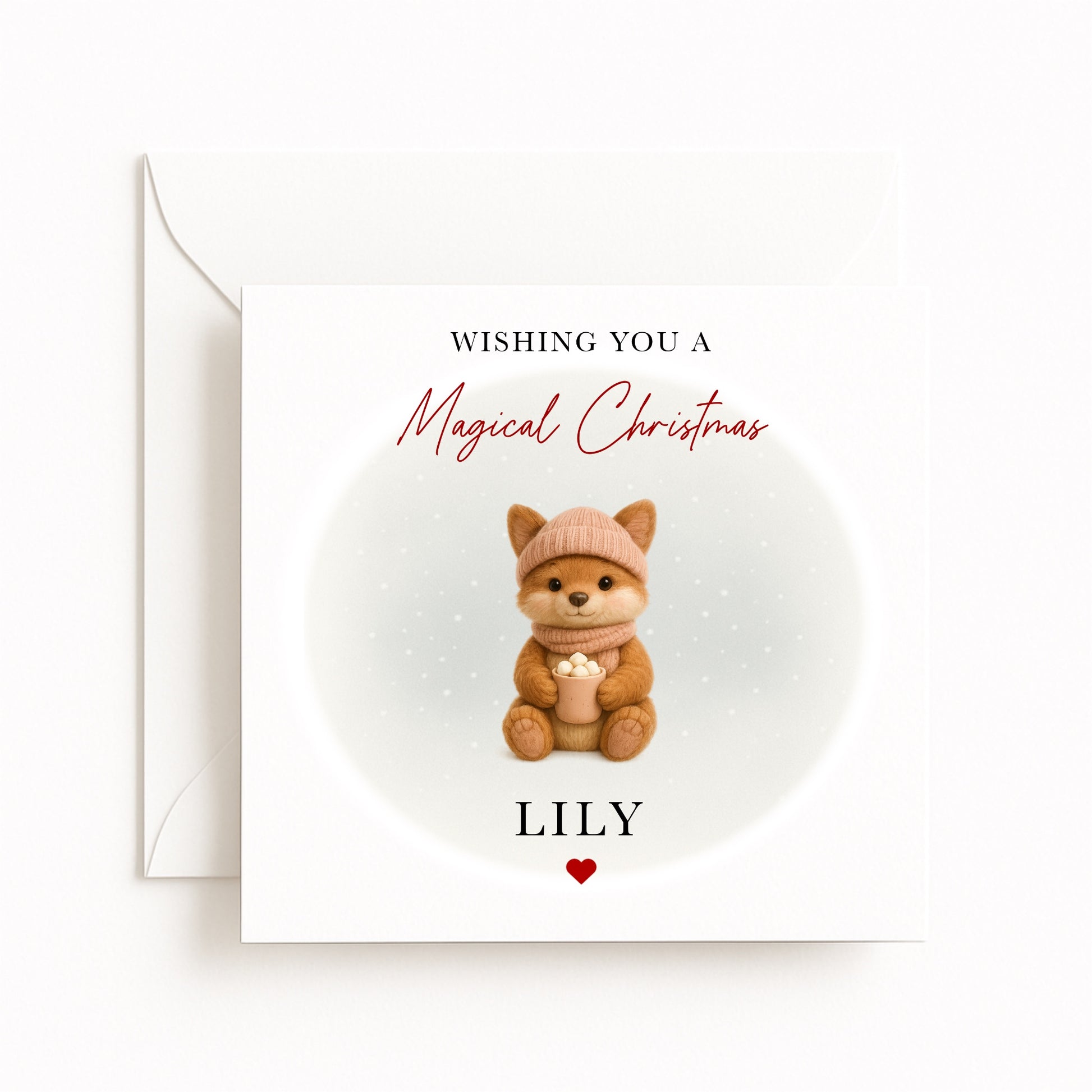 A charming Christmas card featuring a cute Fox in a soft winter scarf and hat, holding a mug of hot chocolate. A lovely keepsake for a special magical Christmas, personalised with their name.