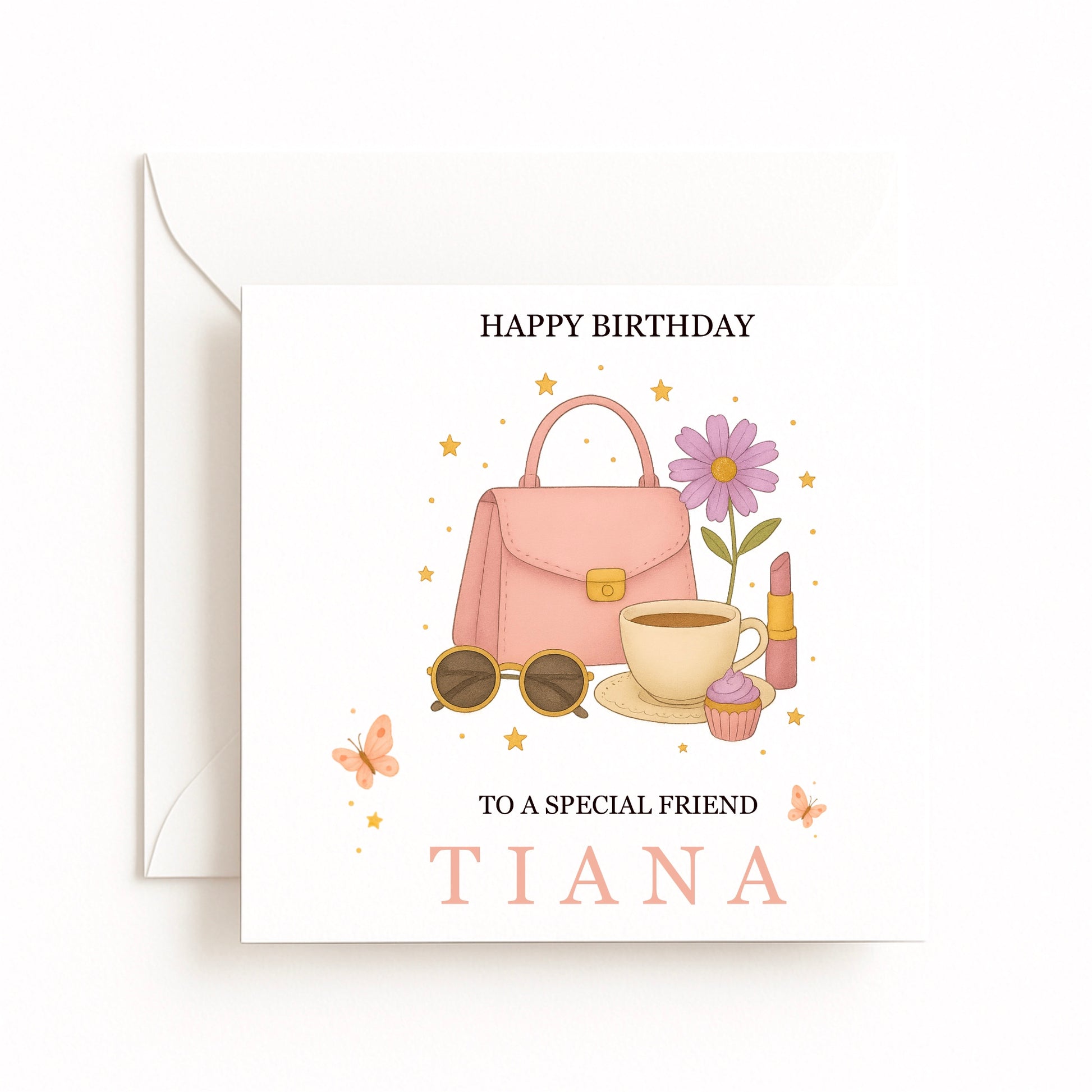 Celebrate her milestone birthday with this stylish birthday card featuring a pink handbag, sunglasses, coffee, lipstick and flowers. Personalised with name for a one-of-a-kind keepsake.