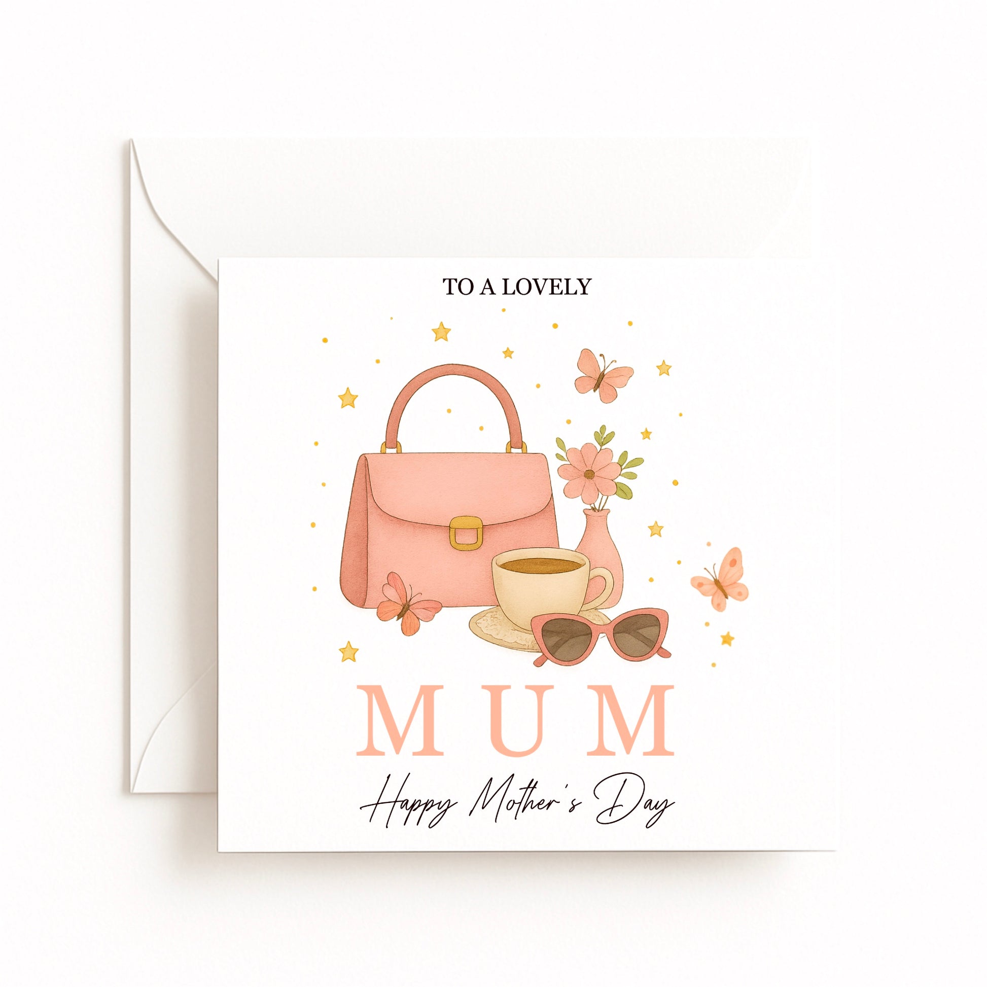 A stylish Mother’s Day card featuring a pink handbag, coffee cup, sunglasses, and butterflies. A chic and modern design for fashionable Mums everywhere.