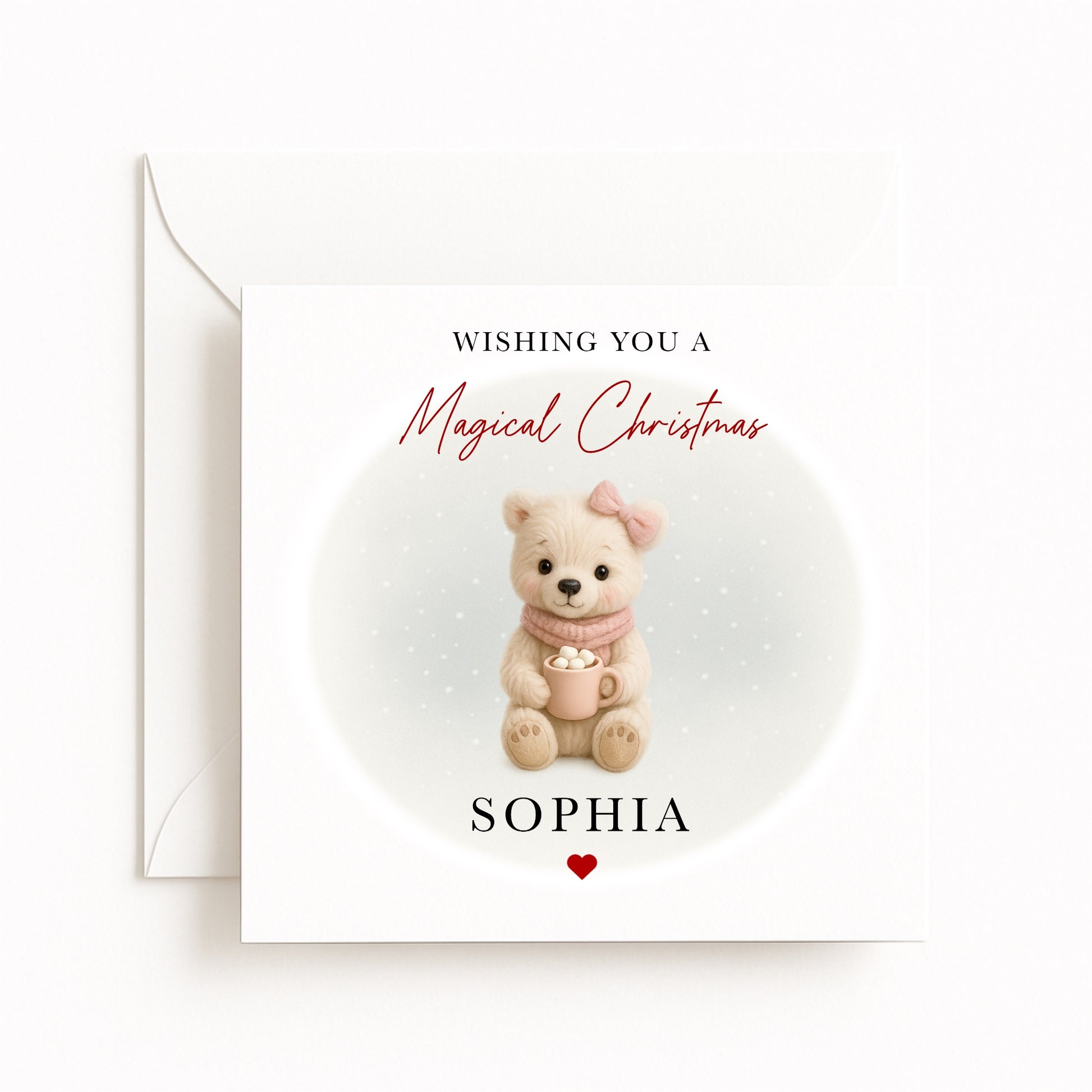A charming Christmas card featuring a cute Polar bear in a soft winter scarf and hat, holding a mug of hot chocolate. A lovely keepsake for a special magical Christmas, personalised with their name.