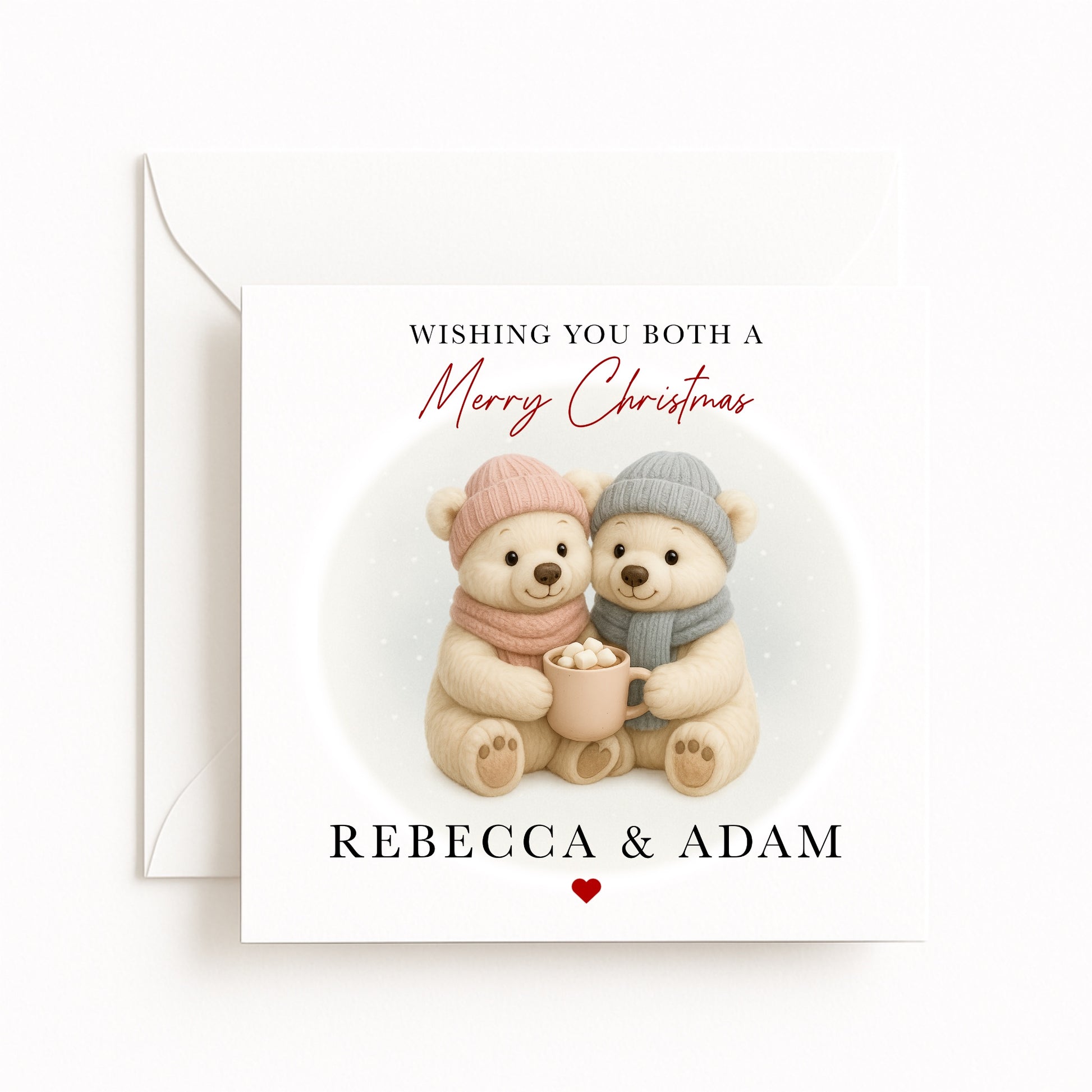 Celebrate love and togetherness with this polar bear couple Christmas card, featuring two soft white bears sharing cocoa in winter hats and scarves.