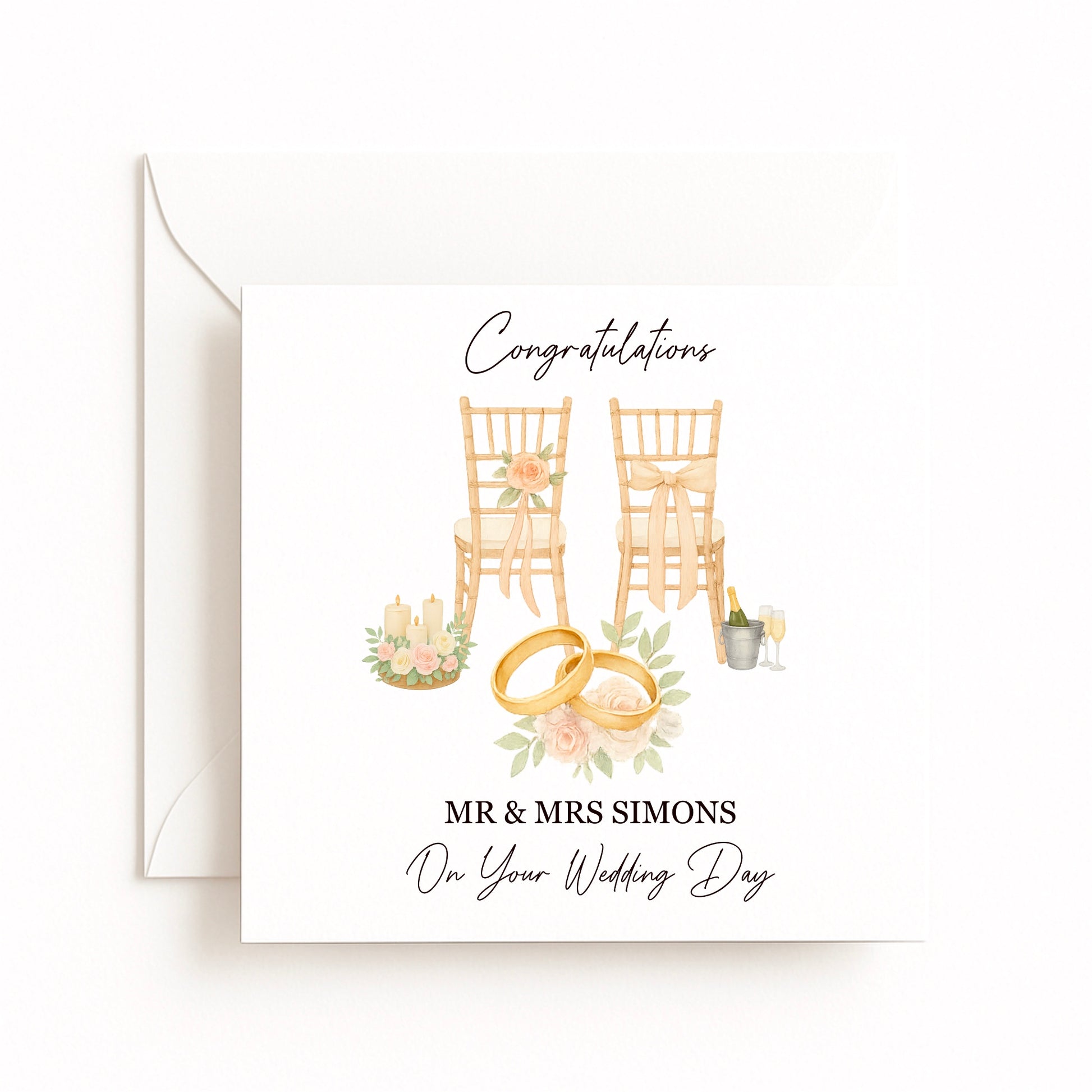 A romantic wedding card decorated with floral chairs, candles, and golden rings. Personalised with the couple’s names for a meaningful keepsake.