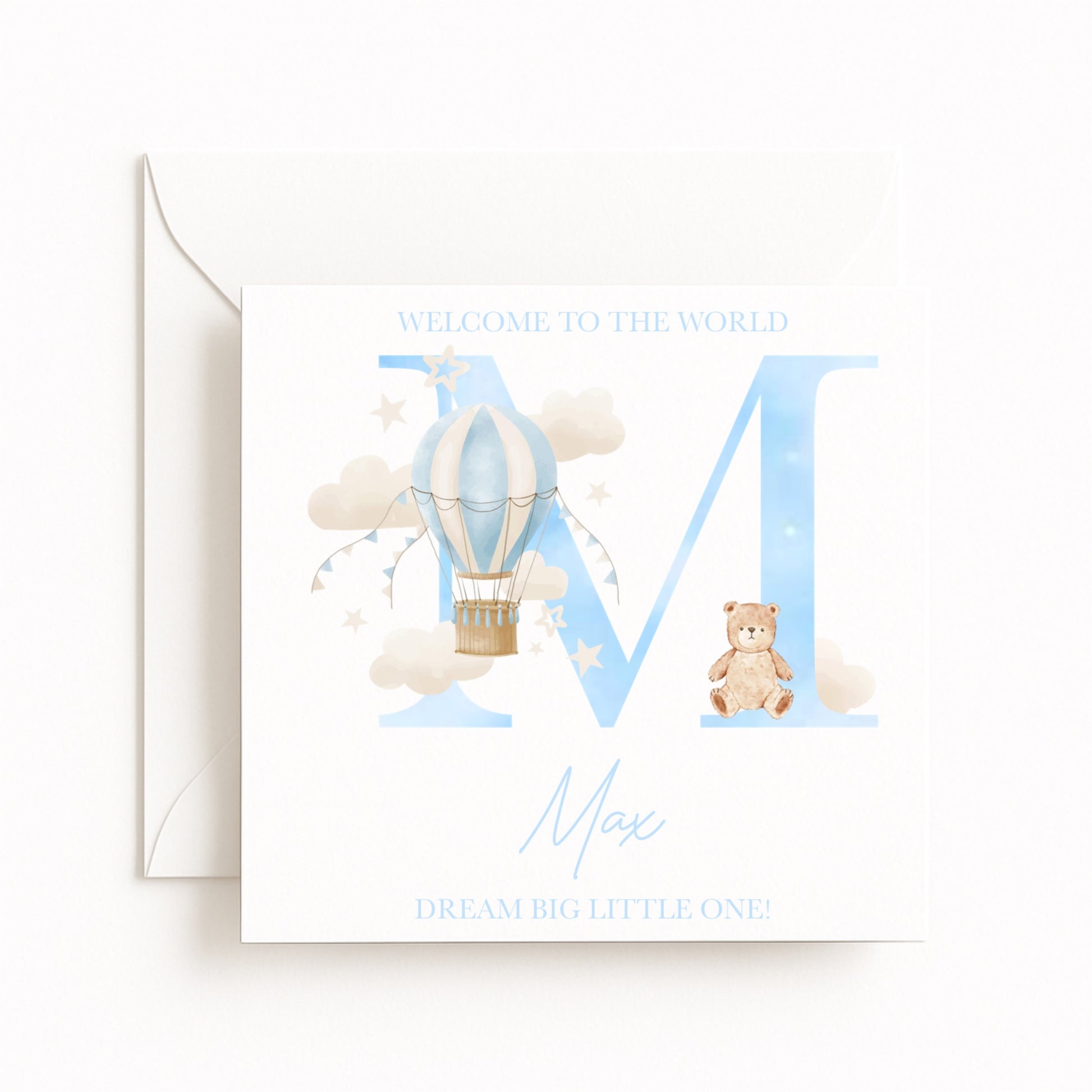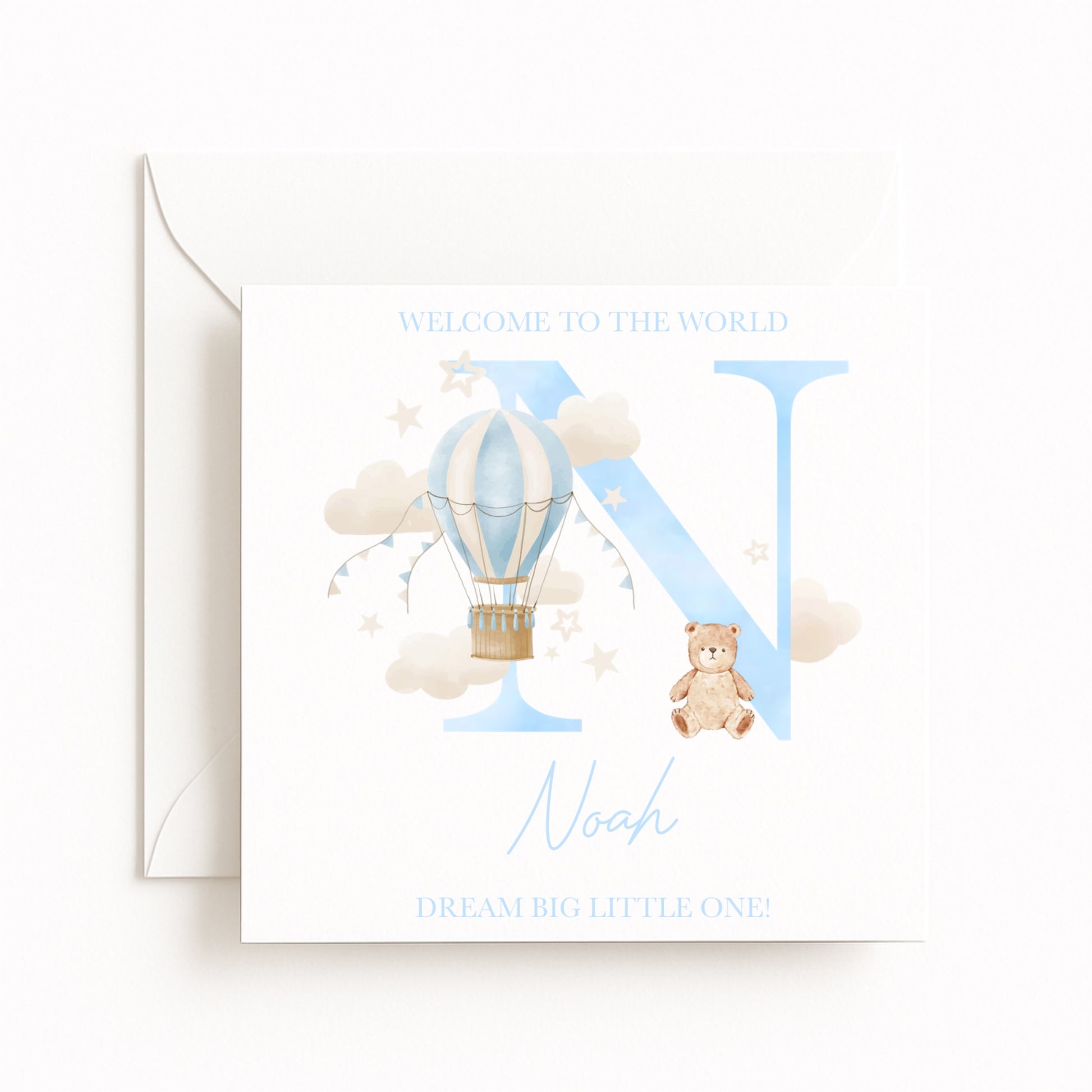 A beautifully illustrated new baby boy card featuring a soft blue hot air balloon floating among clouds, paired with a cuddly teddy bear and the child’s initial.