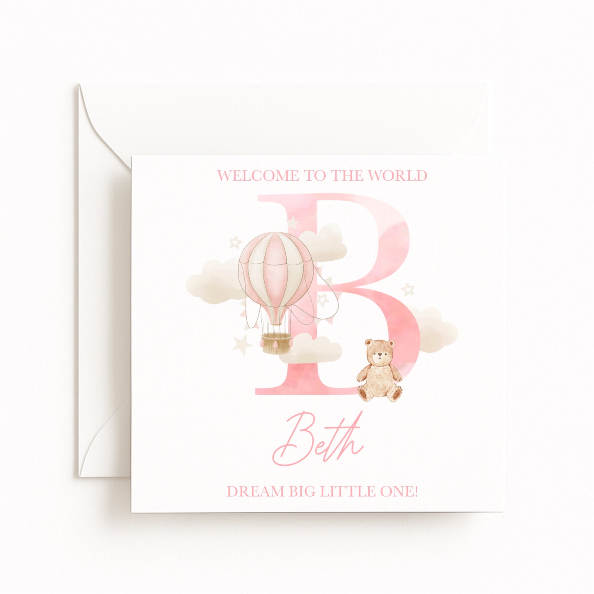 Celebrate a precious new arrival with this adorable personalised baby girl card, featuring a dreamy pink hot air balloon, fluffy clouds and a sweet teddy bear.