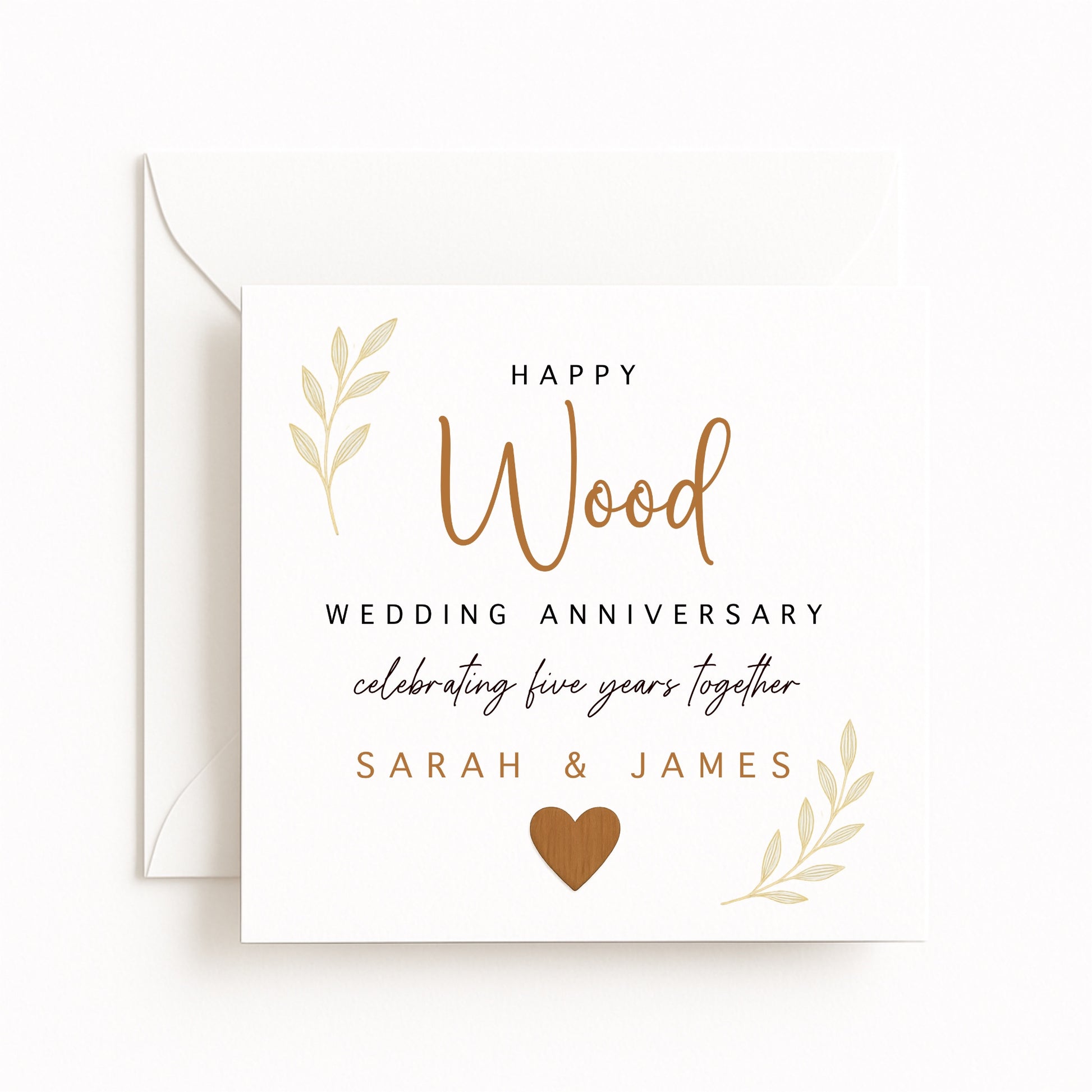 Mark your fifth wedding anniversary with this beautiful Wood Anniversary card, featuring a subtle wood-grain heart and soft botanical accents. A heartfelt keepsake for couples.